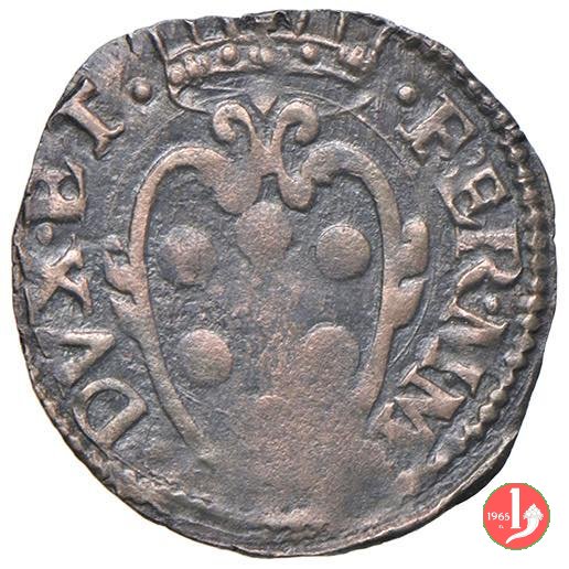 quattrino Dritto: (da destra) FER • M • CA R • MAG • D VX • ETR • III • Stemma di sannitica con giglio in alto e corona granducale, sormontato da cappello cardinalizio, con cordoni e fiocchi; senza cerchio. Il Santo, nimbato, seduto a destra con la testa di fronte, tiene la destra alzata e con la sinistra lunga croce, in atto di predicare; in basso a sinistra nel giro in fuori • 1588 • senza cerchio. | |