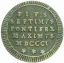 Baiocco del 4° tipo (del Possesso) Dritto: Nel campo su quattro righe: PIVS // SEPTIMVS // PONTIFEX // MAXIMVS; in esergo su due righe in caratteri piú piccoli: MDCCCI • // tre stelle a sei punte. Verso: Stemma semiovale con cimasa a punta, con bordura a trattini in basso, poggiato su mensola e sovrapposto a chiavi decussate con impugnatura trifogliata, sormontato da tiara; attorno, da sinistra in basso: SACR • BASILICAE - LATERAN • POSSES •; in esergo BAIOCCO // linea. | |