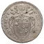 Scudo Romano del 2° tipo Dritto: Stemma ovale in cornice con trifoglio sopra tra due rami d'alloro, sormontato da tiara e chiavi decussate con impugnatura ovale e doppi cordoni; attorno, da sinistra in b.: PIVS VII - PON • M • AN • (anno di pontificato). Verso: La Chiesa seduta sulle nubi, reggente chiavi e tempio; attorno: AVXILIVM - DE - SANCTO - data; sotto a sinistra, la firma dell'incisore G HAMERANI (Giovanni Hamerani); in basso, armetta cardinalizia del Card. Lante, presidente delle zecche (tre aquile). | |