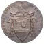 Doppio Giulio (Quinto di Scudo) Dritto: Stemma ovale in cornice fra due rami di olivo, sormontato da tiara e chiavi decussate; attorno, da sinistra in b.: PIVS VII • - P • M • A • e l'anno del pontificato; sotto, TM in monogramma (iniziali dell'incisore Tommaso Mercandetti). Verso: La Chiesa, seduta su nubi, con chiavi e tempio; attorno, da sinistra in b.: AVXILIVM - DE - SANCTO; sotto, • data • segno di zecca • TM in monogramma. | |