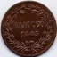 Doppia Romana Dritto: Stemma ovale in cornice sormontato da tiara e chiavi; sotto, rami di lauro; attorno da sinistra in b. LEO XII - P • M • A • e l'anno di pontificato. Verso: San Pietro assiso su nembi di fronte e benedicente con la mano destra mentre regge le chiavi; attorno, da sinistra in b. PRINCEPS - APOSTOLORVM; in basso, indicazione dell'autore (per l'anno I) e segno di zecca. | |