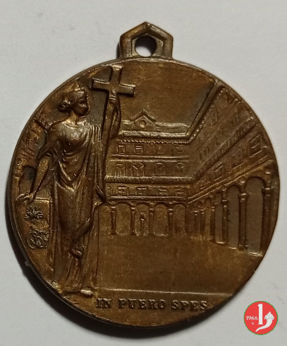 Collegio San Giuseppe di Roma Obverse: La figura allegorica della Chiesa drappeggiata e in piedi regge Croce astile e mira il chiosco del Collegio a sx: monogramma CSG sormontato da stella raggiante in esergo: IN PUERO SPES nel campo: COLLEGIO S. GIUSEPPE = ISTITUTO = DE MERODE = ROMA in basso: patera tra nastri |