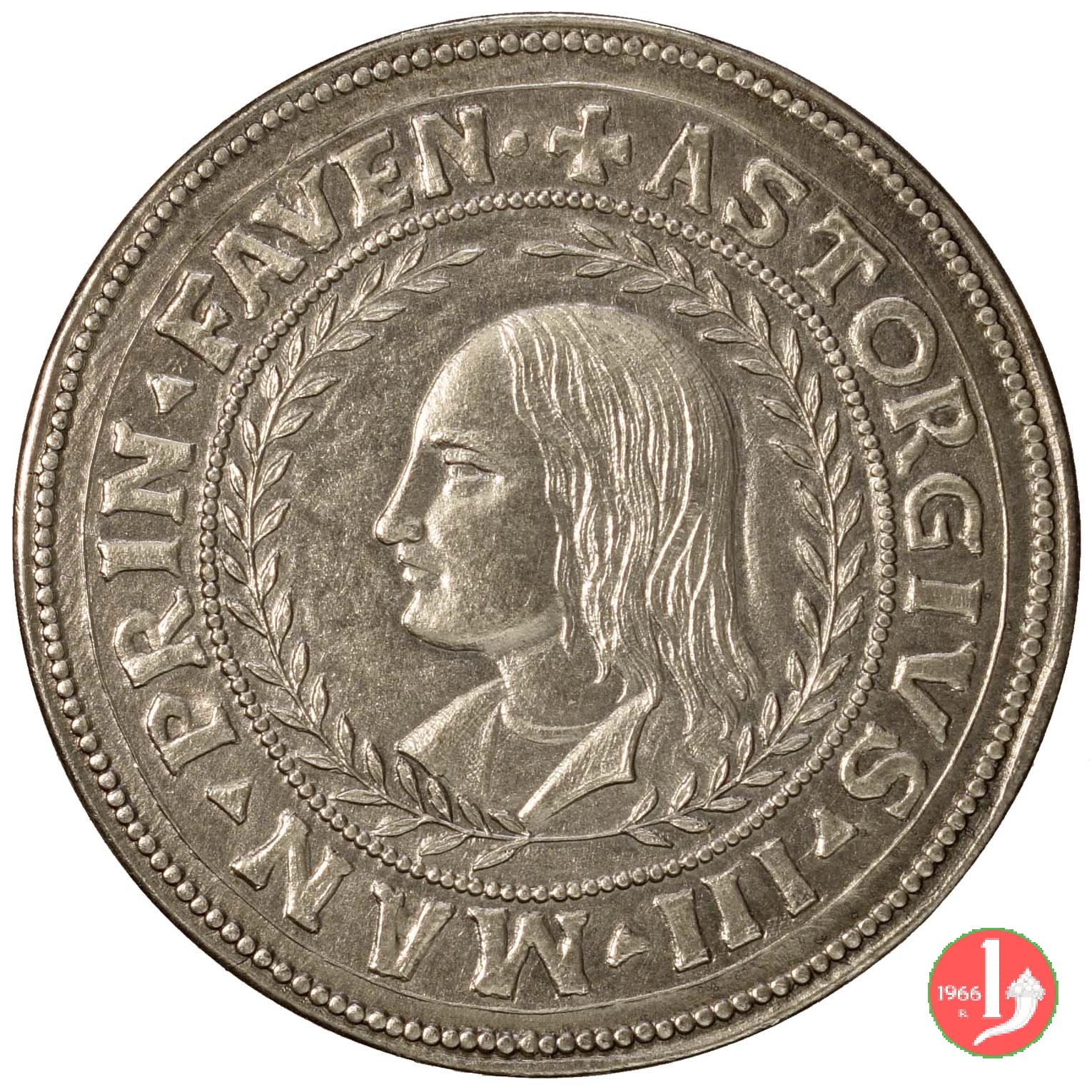Banca del Monte e Cassa di Risparmio di Faenza 1991 Dritto: ✠ ASTORIGIVS • III • MAN • PRIN • FAVEN • entro cerchio perlinato e tra rami d'alloro: busto a sx di Astorgio III Dé Manfredi entro cerchio perlinato: busto di Gesú Cristo nimbato di fronte | |