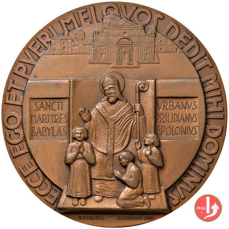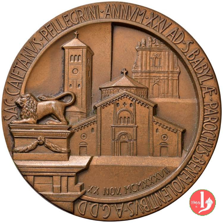25° Gaetano Pellegrini - San Babila 1937 Obverse: ECCE EGO ET PVERI MEI QVOS DEDIT MIHI DOMINVS in alto: vista della Basilica di San Babila in Milano in basso: San Babila Vescovo nimbato, con mitra, pianeta, pallio e pastorale, seduto di fronte, benedice tre fanciulli oranti ai lati del trono, entro riquadri: SANCTI = MARTYRES = BABYLAS _ VRBANVS = PRILIDIANVS = E POLONIVS in esergo: S. JOHNSON _ A. NICOLINI MOD. Vista anteriore della Basilica di San Babila con a sx il Leone di San Marco che sovrasta la colonna di Porta Orientale, antistante la Basilica in basso, entro il semicerchio interno e circolarmente: XX NOV. MCMXXXVII | |