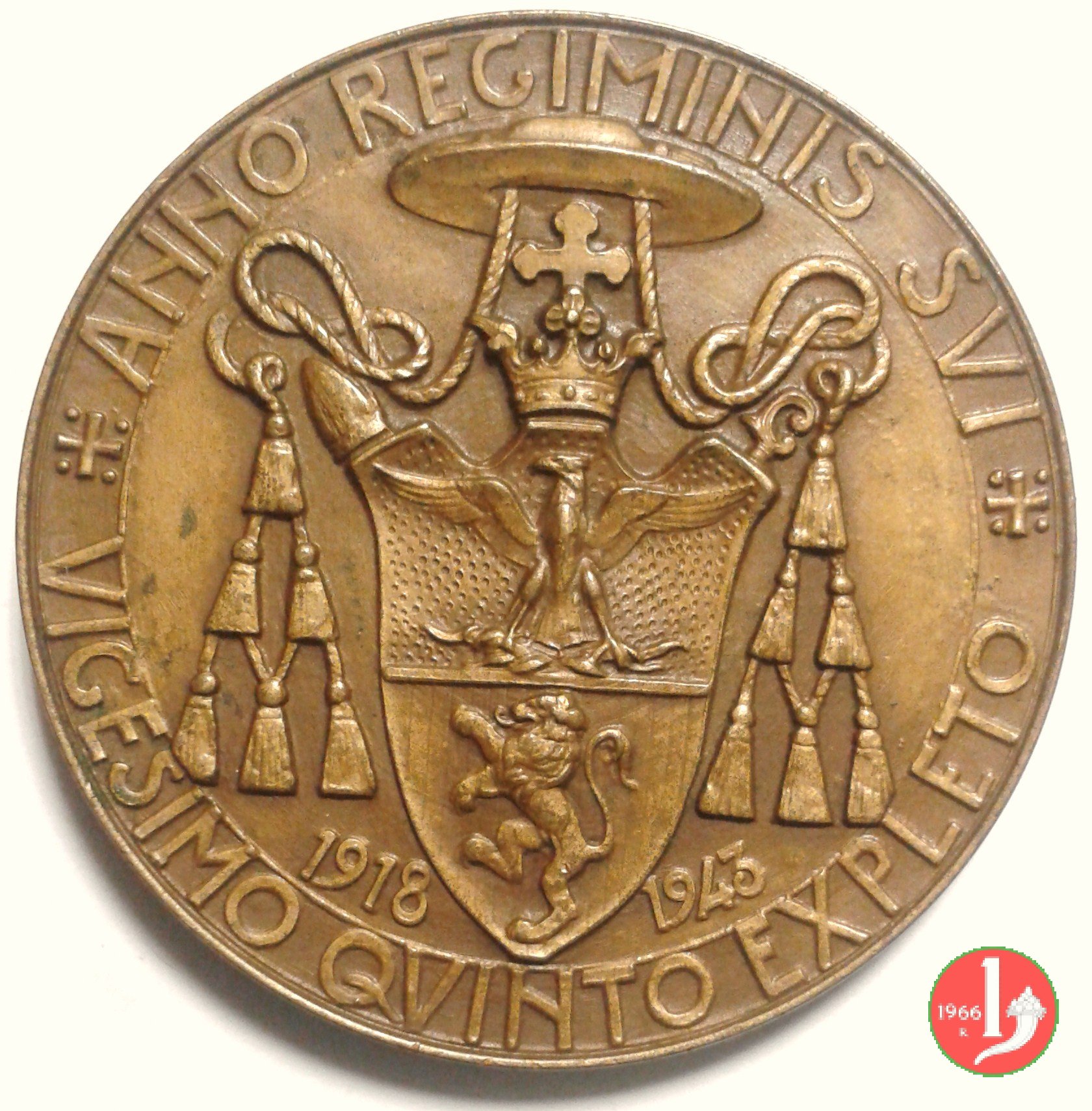 Giuseppe Ramiro Marcone 1943 Dritto: JOSEPH RAMIRVS MARCONE = ✠ ABB • ORD • MONTISVIRGINIS ✠ busto a sx con berretto e mozzetta Stemma sormontato da galero a sei nodi, Croce e corona in basso, ai lati: 1918 _ 1943 | |