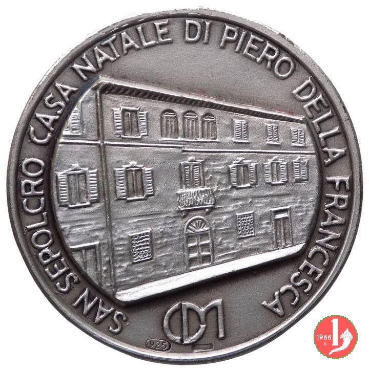 500° Morte Piero della Francesca 1992 Dritto: CINQUECENTENARIO DELLA SCOMPARSA DI PIERO DELLA FRANCESCA = • SETTEMBRE 1992 • circolarmente in seconda riga e inciso: FEDERICO DA MONTEFELTRO - IL _ RITRATTO PIU' FAMOSO DEL GRANDE ARTISTA busto a sx di Federico da Montefeltro vista della Casa Natale in basso: CDM | |