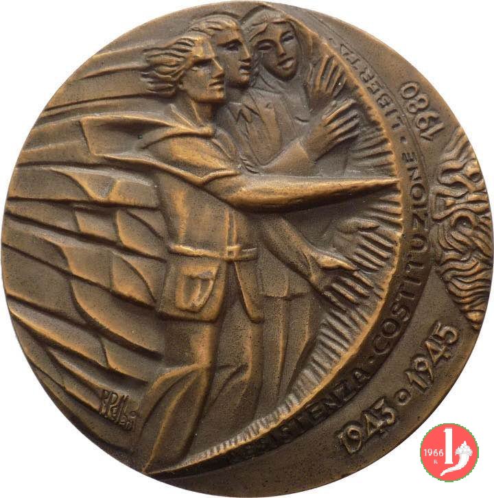 Carpi - Incontro Partigiani-Popolo-Brigata Aristide 1980 Obverse: tre figure in piedi e volte a sx reggono mezza luna contenente l'iscrizione: RESISTENZA • COSTITUZIONE • LIBERTA' a dx lungo il bordo: 1943 • 1945 _ 1980 in basso a sx: R.PELLONI in seconda riga: CARPI 20 APRILE 1980 _ I° ZONA MODENESE Planimetria della zona di CARPI in basso: SJ | |