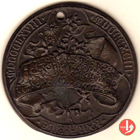 200° Annivers. Reggimento Nizza Cavalleria 1890 -UdS XXX-28 Obverse: UMBERTO I _ VITTORIO AMEDEO II busti accollati a dx dei due Sovrani in alta uniforme e con collari della SS. Annunziata, sormontati da stella a cinque punte sotto: Stemma Savoia coronato tra nodi d'amore in basso, a sx: JOHNSON - MILANO nel campo in alto: aquila Sabauda coronata = A MEMORIA CHE HA _ QUESTO ANNO 1890 = IL REGGIMENTO NIZZA CAVALLERIA = CONTA DUE SECOLI DI VITA SACRATA = AI SUOI RE _ ED ALLA PATRIA in esergo, entro doppio cartiglio sormontato da lance decussate ed elmo: 1690-1890 ai lati dell'esergo: POGLIAGHI • MOD • _ CAPPUCCIO INC. | |