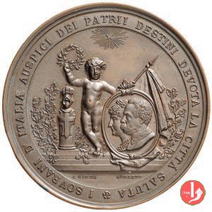50° Statuto Albertino - Omaggio di Pavia 72mm Obverse: L'ATTENDS MDCCCXLVIII MON ASTRE busti accollati a dx di Carlo Alberto, Vittorio Emanuele e Ferdinando di Savoia tra rani di quercia e di alloro con nodi d'amore e stemmi sotto: E.F. INC. in basso: NEL CINQUANTESIMO ANNIVERSARIO DELLO STATUTO = A UMBERTO I E MARGHERITA DI SAVOIA = I PAVESI RICONOSCENTI = dedicano = MDCCCXCVIII sotto, ai lati: DALL'ACQUA G. IDEO' _ JOHNSON-MILANO sotto, entro cartiglio bordato da rami d'alloro e di quercia e con stella raggiante: TRA LE ACCLAMAZIONI ENTUSIASTICHE DEL POPOLO = IL XXIX MARZO MDCCCXLVIII = IL MAGNANIMO SAVOJA = E FERDINANDO DUCA DI GENOVA = LASCIATA LA BANDIERA AVITA AL DI LA' DEL TICINO = SPIEGATO IL TRICOLORE VESSILLO = PER MUOVERE CONTRO LO STRANIERO = ALLA TESTA DELLE SCHIERE SUBALPINE = ENTRAVA PER LO STORICO PONTE IN PAVIA = ORGOGLIOSO D'OSPITARE PRIMA TRA LE CITTA' LOMBARDE = IL RE LIBERATORE GLI AUGUSTI PRINCIPI = IL VALOROSO ESERCITO | |