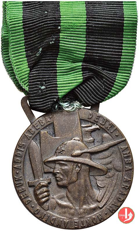 Dritto: militare in piedi e volto a dx regge fascio e carabina e pone piede su aratro, sullo sfondo paesaggio africano