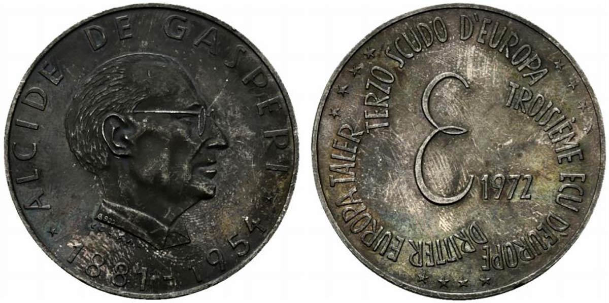 Alcide De Gasperi - 22° Consiglio d'Europa 1971 Dritto: ALCIDE DE GASPERI _ 1881-1954 busto di 3/4 a dx con giacca, camicia e cravatta in basso a dx: KRAMER nel campo: 22e = ANNIVERSAIRE = DE LA FONDATION = DU CONSEIL = DE L'EUROPE = 1949-1971 | |