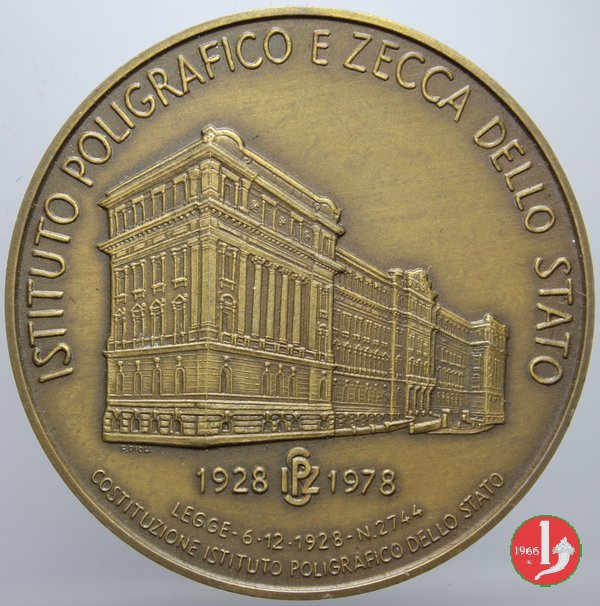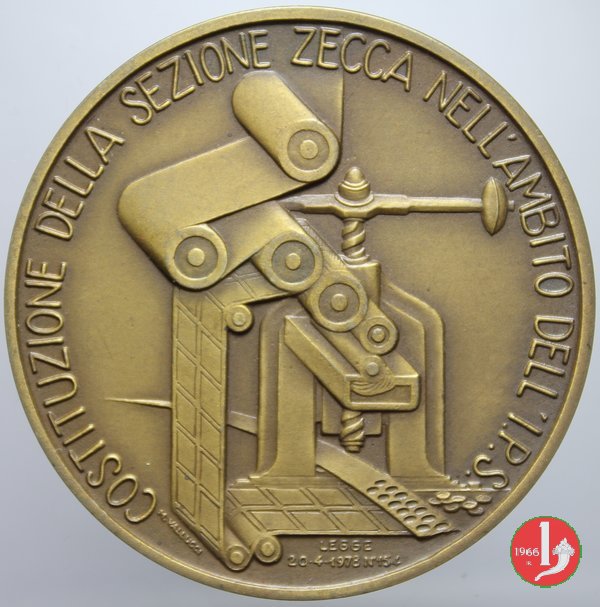 Sezione Zecca dell'IPS 1978 Dritto: COSTITUZIONE DELLA SEZIONE ZECCA NELL'AMBITO DELL' I.P.S. Torchio e rotoli sotto: LEGGE = 204 1978 Vista del Palazzo della Zecca a Roma in basso: 1928 IPZS 1978 sotto circolarmente: LEGGE 6 • 12 •1928 • N. 2744 = COSTITUZIONE ISTITUTO POLIGRAFICO DELLO STATO | |