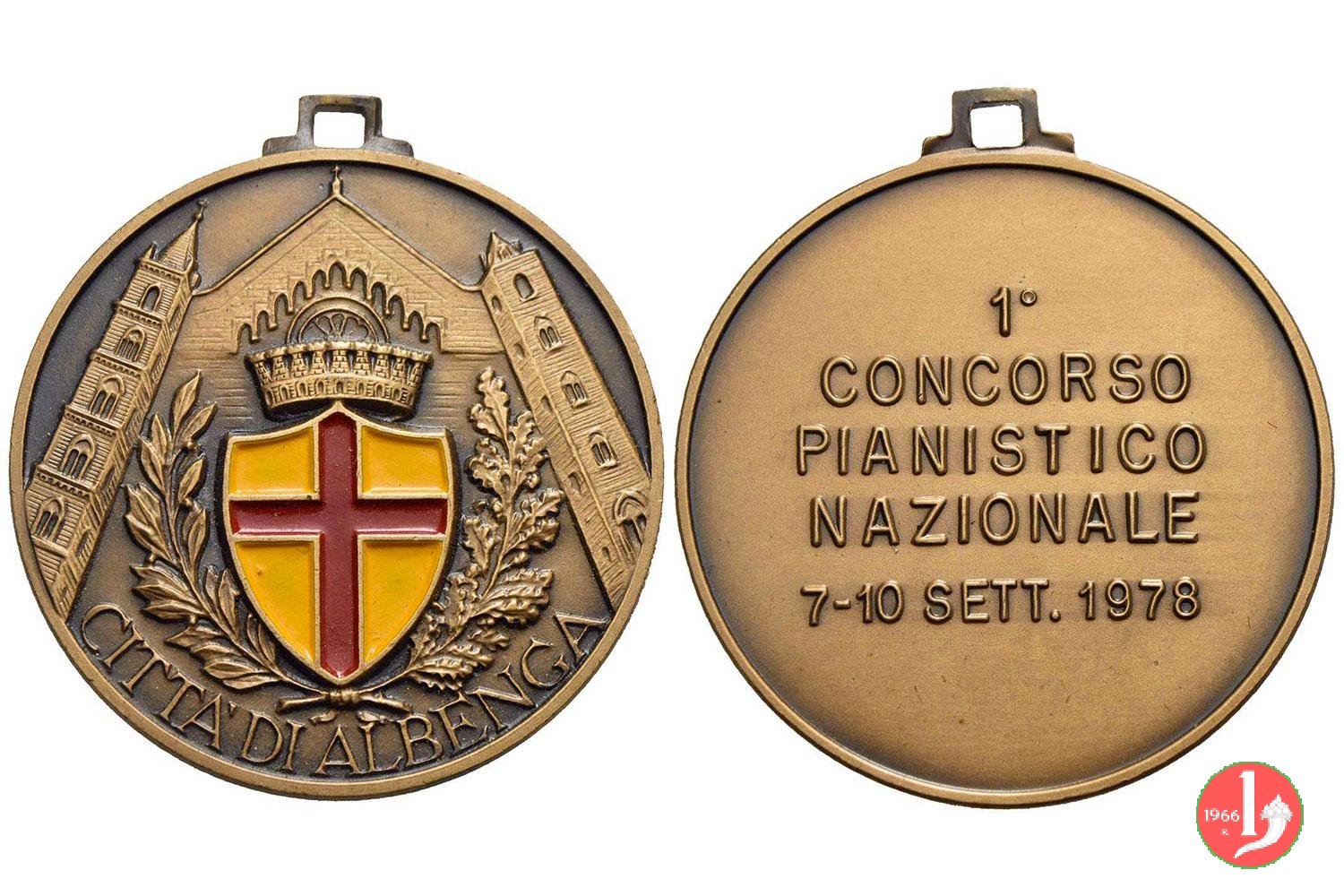 Albenga - Concorso Pianistico Nazionale 1978 Dritto: Stemma turrito della Città di Albenga tra rami d'alloro e quercia, sormontato dalla facciata della Cattedrale di San Michele Arcangelo con le due torri campanarie in basso circolarmente: CITTA' DI ALBENGA | |