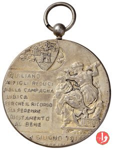 Quiliano ai Reduci della Campagna di Libia 1913 Dritto: Parata militare trionfale con figure femminili che suonano trombe, militari e cavaliere volti di 3/4 a sx Verso: in alto: Stemma di Quiliano nel campo, a sx con a fianco la Sibilla Libica (particolare tratto dalla Cappella Sistina): QUILIANO = AI FIGLI REDUCI = DALLA CAMPAGNA = LIBICA = PERCHE' IL RICORDO = SIA PERENNE = INCITAMENTO = AL BENE in esergo: 1 GIUGNO 1913 in basso: M. NELLI | |