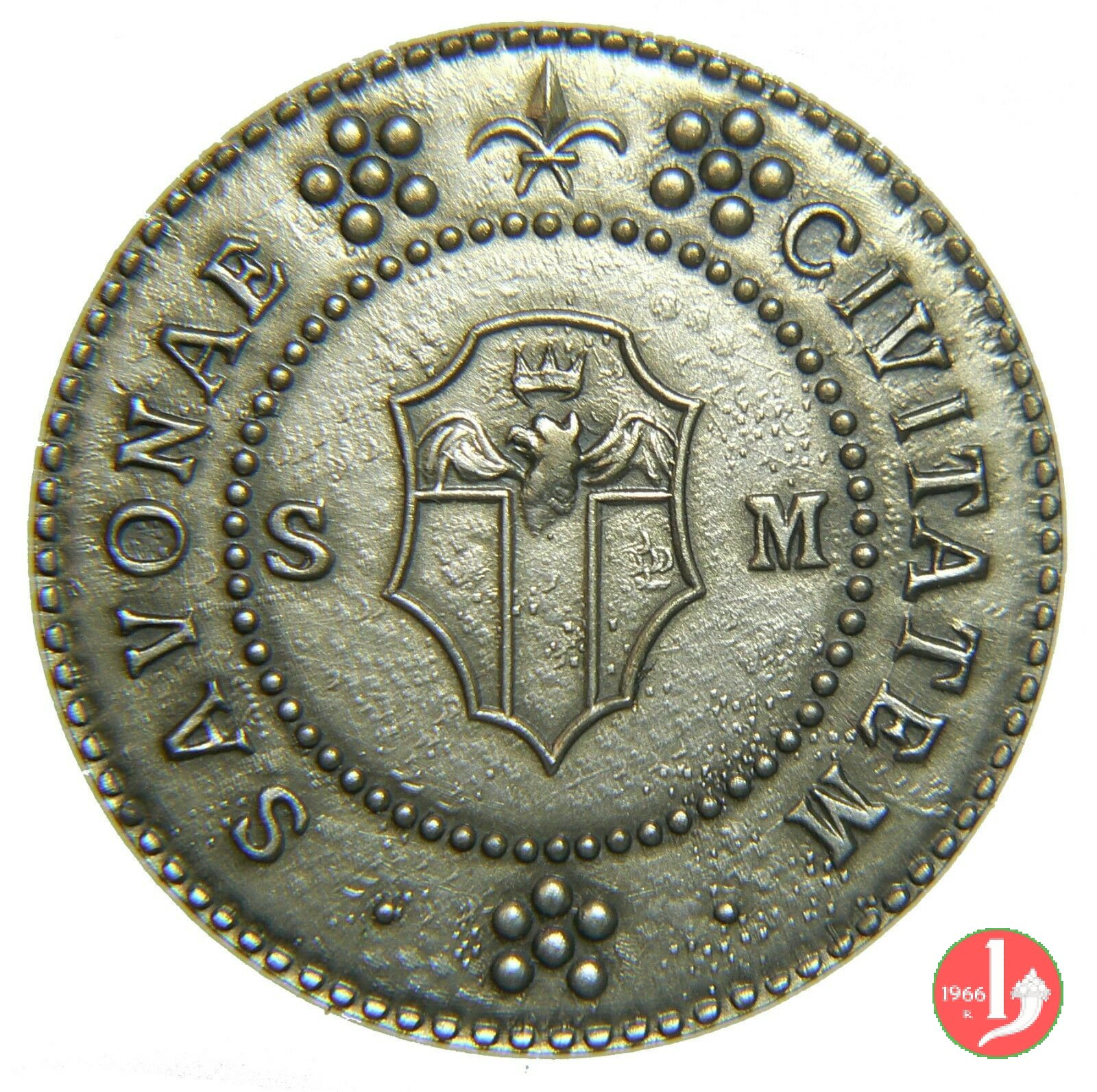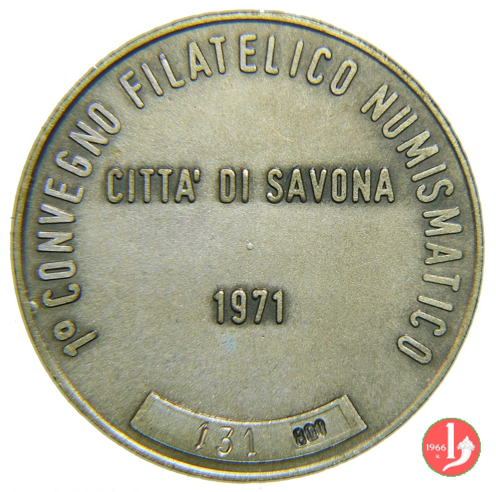 1° Convegno Numismatico di Savona 1971 Dritto: CIVITATEM • _ • SAVONAE (alternate a cinque sfere e con giglio in alto) entro cerchio perlinato: stemma di Savona tra S _ M nel campo: CITTA' DI SAVONA = 1971 in basso: numerazione entro nastro | |