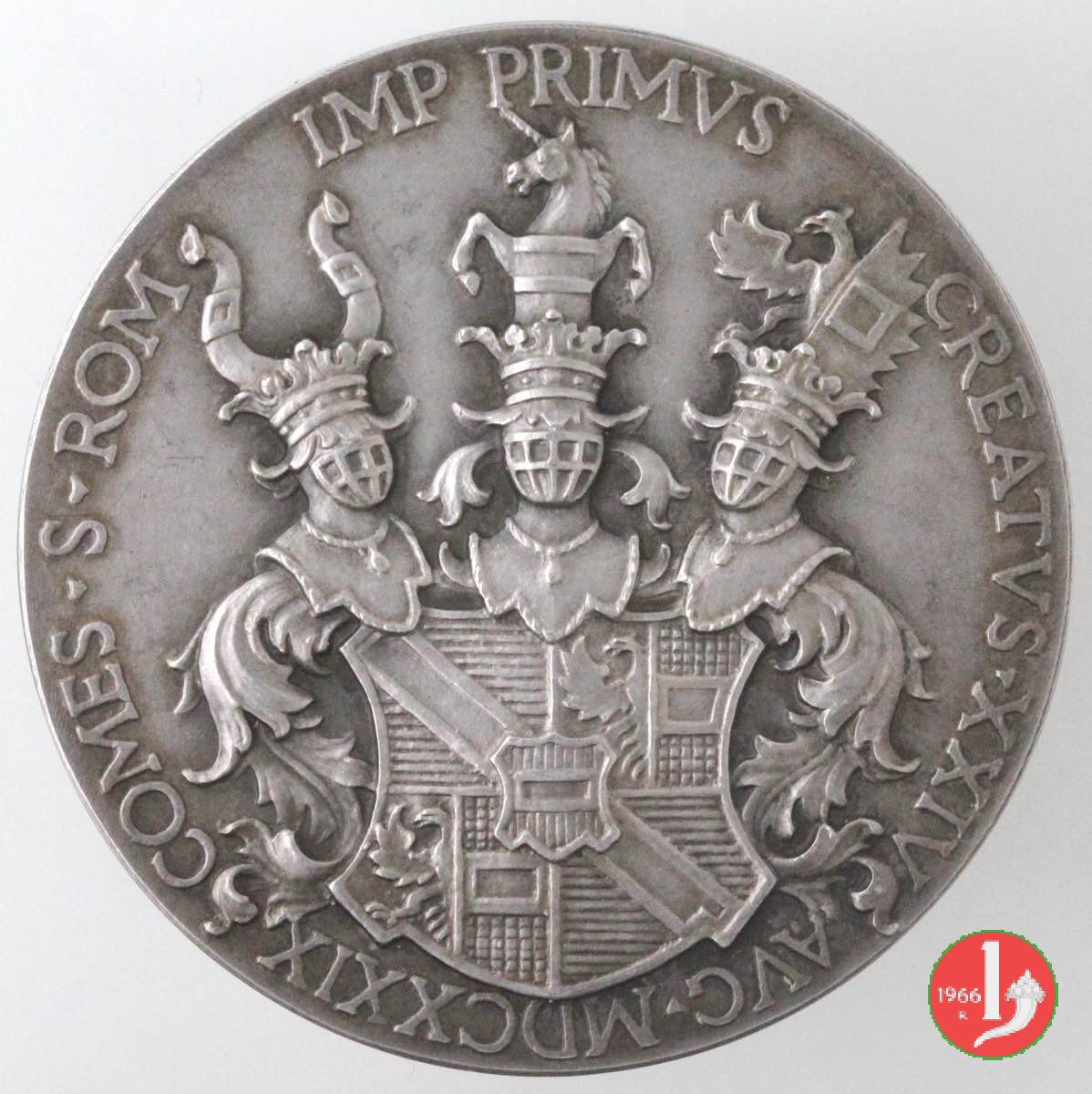 Verso: mitra tra aquila ad ali spiegate e due leoni rampanti a sx