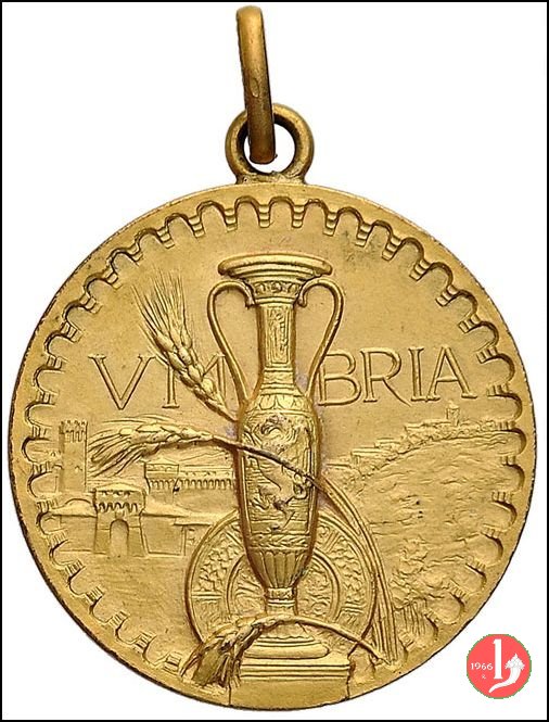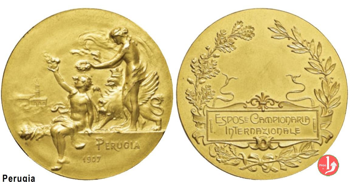 Dritto: Decorazione ovale posta entro ghirlanda di alloro dorata sormontata da cinque raggi bicolori a smalto celesti bordati di bianco, sormontata da nastro in smalto rosso contente GRAN PREMIO e da corona dorata e con smalti rossi, all'interno dell'ovale grifone rampante a sx entro campo rosso contornato da nastro blu contente III ESPOS. CAMP. NAZION. = • PERUGIA 1904 •
