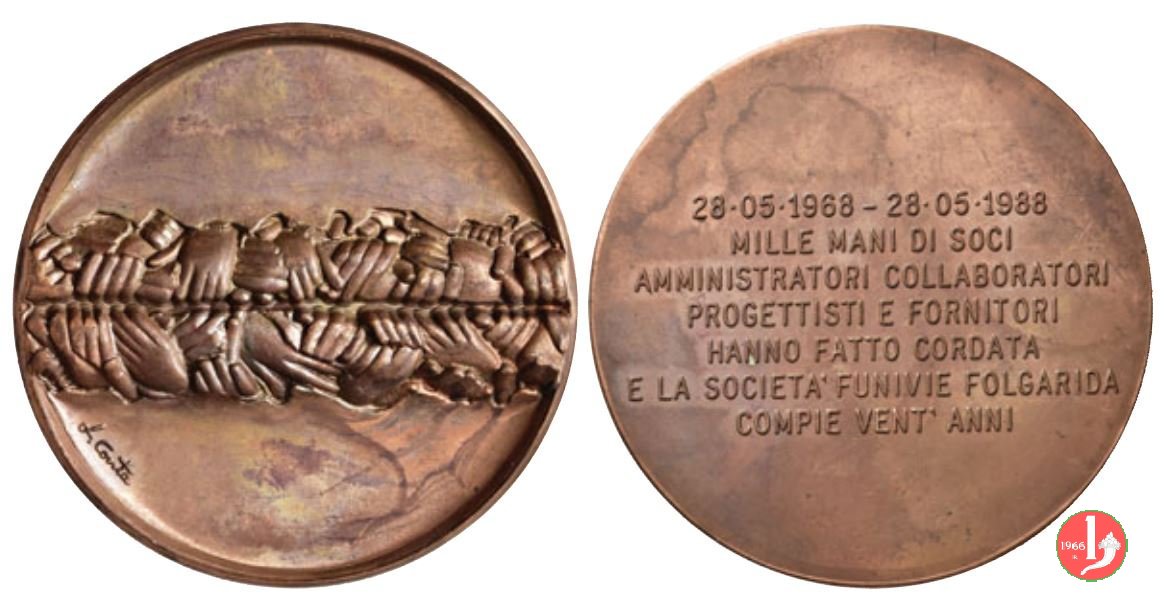 Verso: nel campo: 28 • 05 • 1968 - 28 • 05 • 1988 = MILLE MANI DI SOCI = AMMINISTRATORI COLLABORATORI = PROGETTISTI E FORNITORI = HANNO FATTO CORDATA = E LA SOCIETA' FUNIVIE FOLGARIDA = COMPIE NENT'ANNI