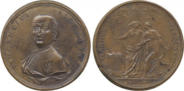 Vincenzo Riccati -V1620 Dritto: VINCENTIVS _ RICCATVS * busto di fronte con veste talare e mantello F • BALVGANI Figure allegoriche della Religione con Croce astile irraggiata da triangolo divino e della Scienza con strumenti e affiancata da globo, in piedi di fronte in esergo: MDCCLXXVI | |