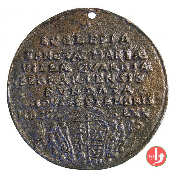 Chiesa di Maria Vergine a Brescia -V1556 Dritto: Stemma coronato, entro cartiglio, su bandiere e sormontato da leone di San Marco di fronte Verso: nel campo, incuso: SACELLO HOC = B.V.M. PATROCINII SACRUM = VENERI DIRUTO = REAEDIF. CUR COMM. ET DEVS = PIETATE ET OPERE = EXCELL. CO. LUD. MANINI PR. ET ERIX. = IN PATRIUM ELECTI = J.O. CARD. MOLINO BRIX. EPIS. = PRIM. LAP. POSUIT = JO. PET. DELPHINOS. I AUR. PR. EP. = UNDECIMO KAL. DECEMBR. = MDCCLXXII. | |