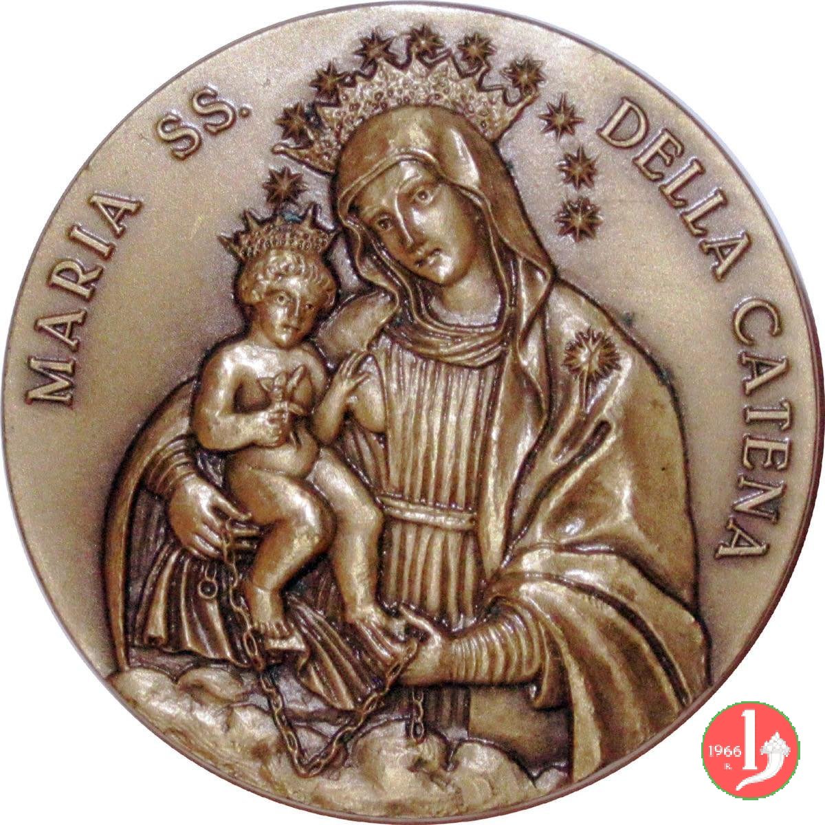 Laurignano - Santuario Maria della Catena 2006 Dritto: MARIA SS. _ DELLA CATENA busto velato e coronato di fronte della B. V. Maria con il Bambino Gesú coronato, regge catena vista del Santuario Maria della Catena in alto a dx: Cuore sormontato da Croce JESU XPI = PASSIO = tre chiodi decussati in esergo: 100 ANNI DI PRESENZA = ✠ PASSIONISTA ✠ = A LAURIGNANO | |