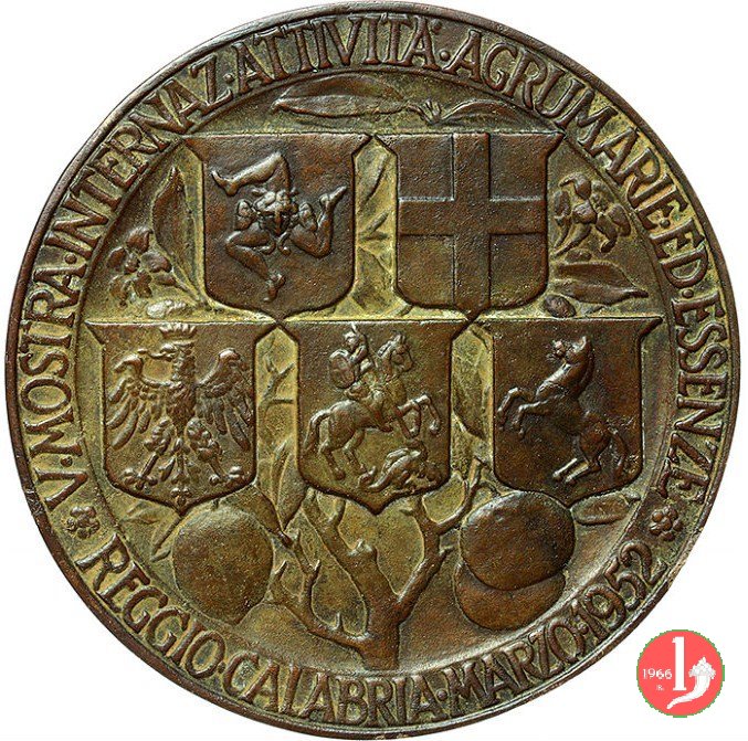 V Mostra Internaz. Attività Agrumarie 1952 Dritto: figura femminile genuflessa verso dx reca cesto d'aranci e annusa ramo ai lati: SVA _VITA = TES in esergo: MISTRVZZI cinque stemmi a scudetto e sullo sfondo albero d'aranci | |