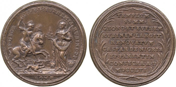Cons. Duomo SS. Giorgio e Eufemia a Rovigno Dritto: S • GEOR _ GIVS • S • EVPHEMIA _ RVBINI • PP • San Giorgio, a cavallo verso dx, trafigge il drago; a dx S. Eufemia di Calcedonia nimbata e paludata, in piedi, regge chiesa in miniatura e ramo di palma in esergo: ROMAE | |
