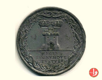 Maria Luisa di Borbone-Parma e Carlo IV 1790 Dritto: REGI • MAX • CAROLO • IIII • OPT • QUE • REGINA • E • ALOISIAE busti accollati a dx di Carlo IV con parrucca, fascia e decorazioni e di Maria Luisa con nastro tra i capelli sotto: Minerva seduta a sx, regge asta e scudo con Stemma su chiavi decussate e sormontato da triregno; sullo sfondo libreria e a sx mappamondo in esergo: GIL | |