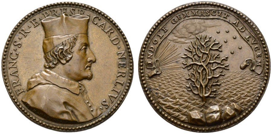 Francesco Nerli Dritto: FRANC • S. R • E • PRESR • CARD • NERLIVS • busto a dx con piviale sul taglio spalla: IO in alto in nastro: INDOLE GEMMASCIT AD LVCEM | |