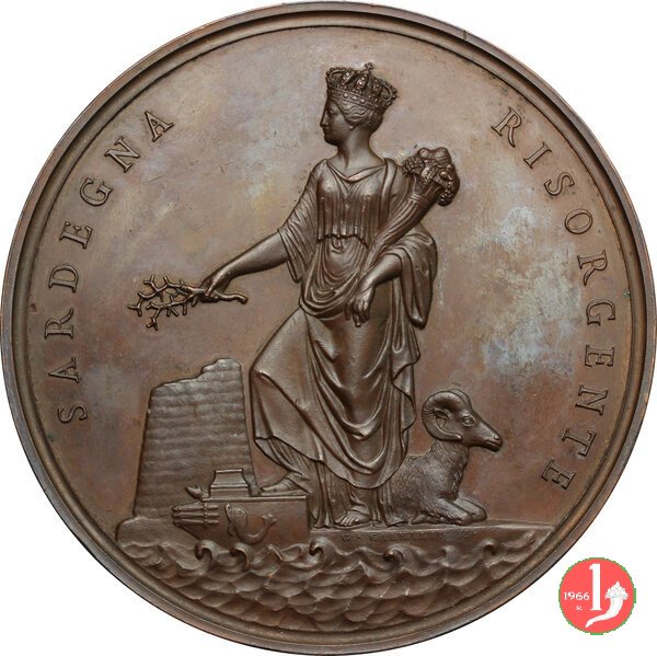 Abolizione della Feudalità in Sardegna 1831 Dritto: SARDEGNA _ RISORGENTE La figura allegorica della Sardegna in piedi su molo e volta a sx, coronata, regge cornucopia e ramo di corallo e posa piede su prua di nave in mare agitato, ai lati capra distesa a dx e nuraghe a sx sul molo: G. GALEAZZI F. La figura allegorica della Storia seduta verso dx su scudo con stemma della Sardegna, incide su altro scudo: REGNANTE = CARLO = ALBERTO = MDCCCXXXI-XLV. in esergo: G. GALEAZZI F. | |