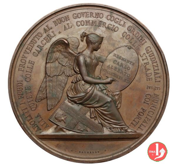 Nuovo Codice legislativo Dritto: CAROLVS ALBERTVS _ REX SARDINIAE busto a sx sul taglio spalla: G.F. Il Re, a dx, in piedi, davanti al trono, riceve da figura allegorica velata il nuovo testo legislativo, a sx paggio regge stemma a scudetto quadripartito, sullo sfondo al centro ara con corona e stemma Savoia in esergo: XIII. KAL • IVL • A • MDCCCXXXVII = REGNI • VII a sx | |