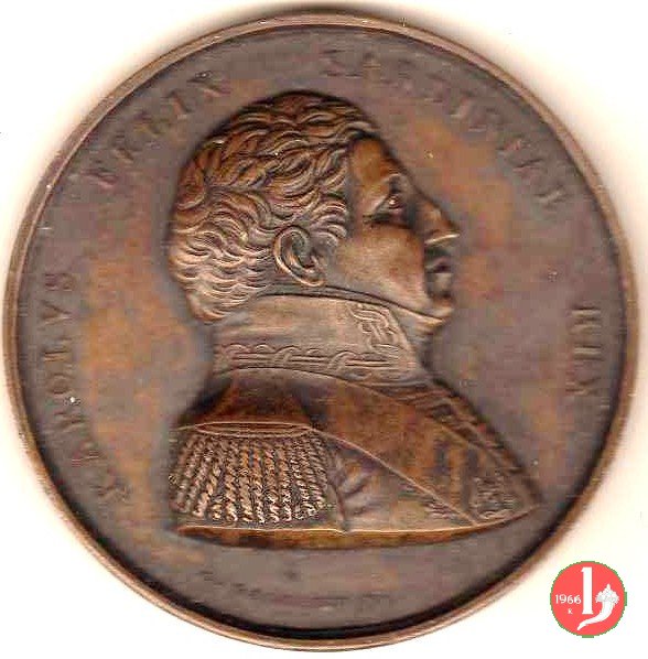 Accademia delle Arti Dritto: CAROLO FELICI REGI OPTIMO ACADEMIA INSTAVRATA busto a sx con uniforme e decorazioni sotto: C. LAVY F. Minerva elmata e seduta verso sx, tra civetta e regge scudo e serti d'alloro | |