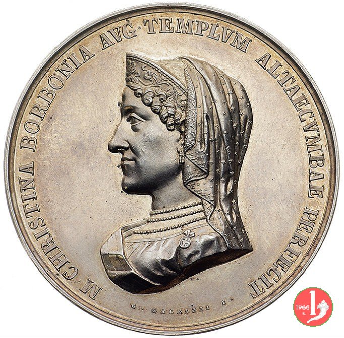 Sepolcro di Carlo Felice ad Altacomba 1841 Dritto: M. CHRISTINA BORBONIA AVG. TEMPLVM ALTAECVMBAE PERFECIT Busto diademato e velato a sx, di Maria Cristina Borbone, vedova del Re di Sardegna, con tre girocolli di perle sotto: G. GALEAZZI F. Prospetto anteriore della chiesa di Altacolomba sulla linea dell'esergo: ERN. MEDANA ARCH. _ G. GALEAZZI F. in esergo: MDCCCXLI | |