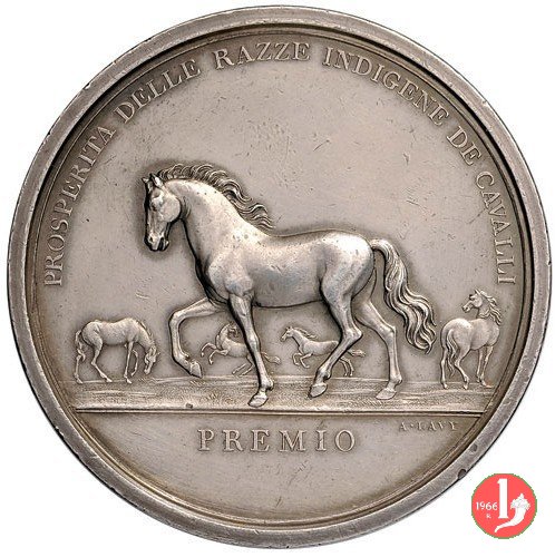 Incremento Razze Equine 1825 Dritto: IL RE CARLO FELICE busto a sx con uniforme e decorazioni sotto: G. FERRARIS F. E INV. Cavalla e puledro rampanti verso dx in esergo: PREMIO sotto la linea dell'esergo a dx: G • F | |