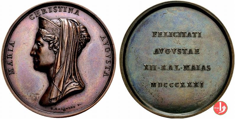 Ferdinando d'Ungheria e Maria Pia 1831 Dritto: FERDINANDVS VNG. REX _ MARIA NNA PIA AVG. busti accollati a dx, Maria Pia con mantello e diadema sotto: G. FERRARIS F. Stemmi affiancati d'Ungheria e dei Savoia, al centro torce ardenti decussate e legate da corone di fiori sotto: AVG. TAVRINORVM = A. MDCCCXXXI in basso: C.F. | |