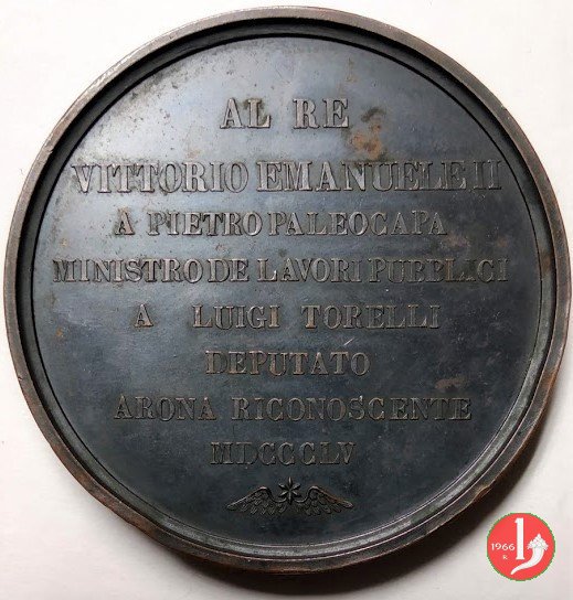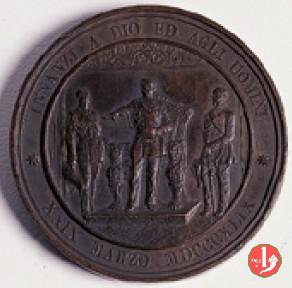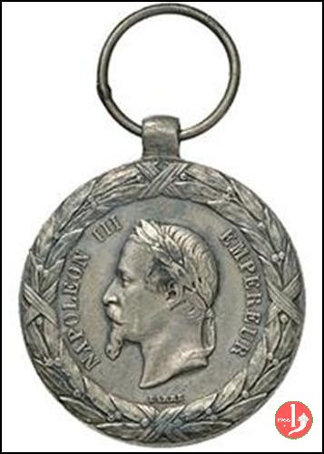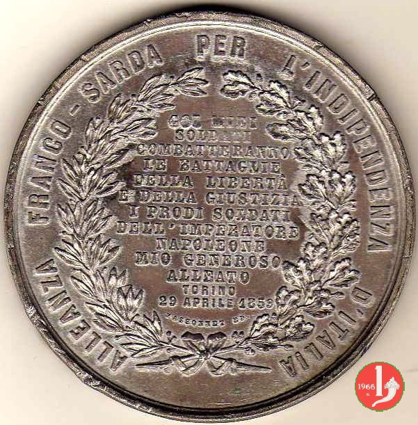 Legenda entro rami d'alloro e di quercia legati in basso: COI MIEI = SOLDATI = COMBATTERANNO = LE BATTAGLIE = DELLA LIBERTA' = E DELLA GIUSTIZIA = I PRODI SOLDATI = DELL'IMPERATORE = NAPOLEONE = MIO GENEROSO = ALLEATO = TORINO = 29 APRILE 1859