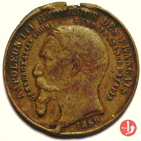 Verso: nel campo sopra a rami d'alloro decussati: VICTOIRE = DE = MONTEBELLO, PASTRENGO = MAGENTA, MARIGNAN, = SOLFERINO