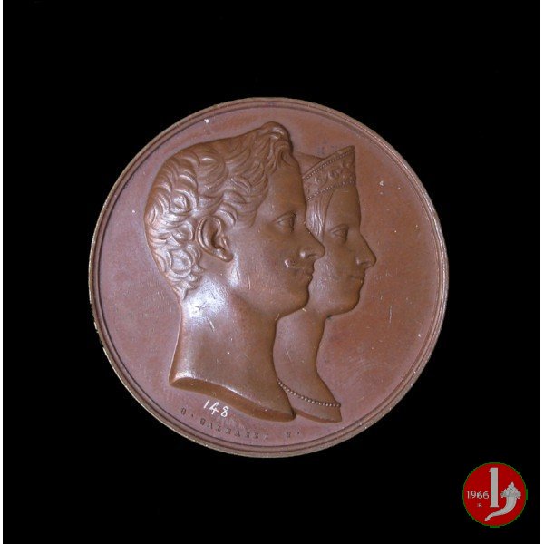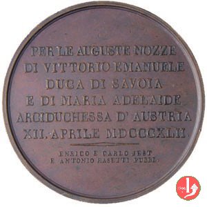 Verso: nel campo: PER LE AUGUSTE NOZZE = DI VITTORIO EMANUELE = DUCA DI SAVOIA = E DI MARIA ADELAIDE = ARCIDUCHESSA D'AUSTRIA = XII APRILE MDCCCXLII. = - = ENRICO E CARLO JEST = E ANTONIO RASETTI PUBBL.