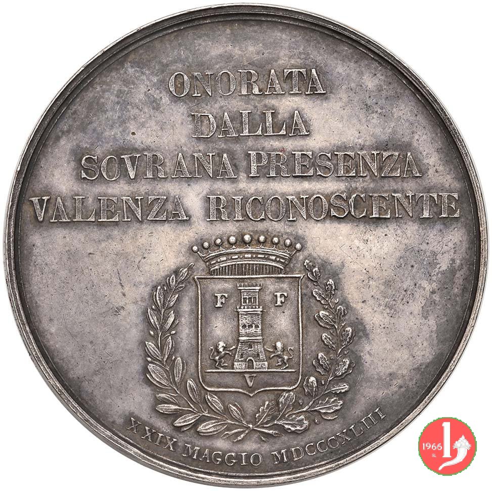 Verso: nel campo: ONORATA = DALLA = SOVRANA PRESENZA = VALENZA RICONOSCENTE = Stemma coronato della Città tra rami d'alloro e quercia = XXIX MAGGIO MDCCCXLIII
