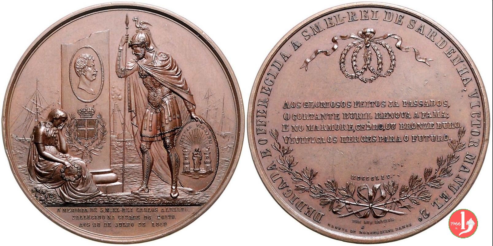 La Vittoria seduta verso dx sullo scudo sardo scrive su lastra ovale: REGNANTE = CARLO = ALBERTO = MDCCCXXXI - LXV