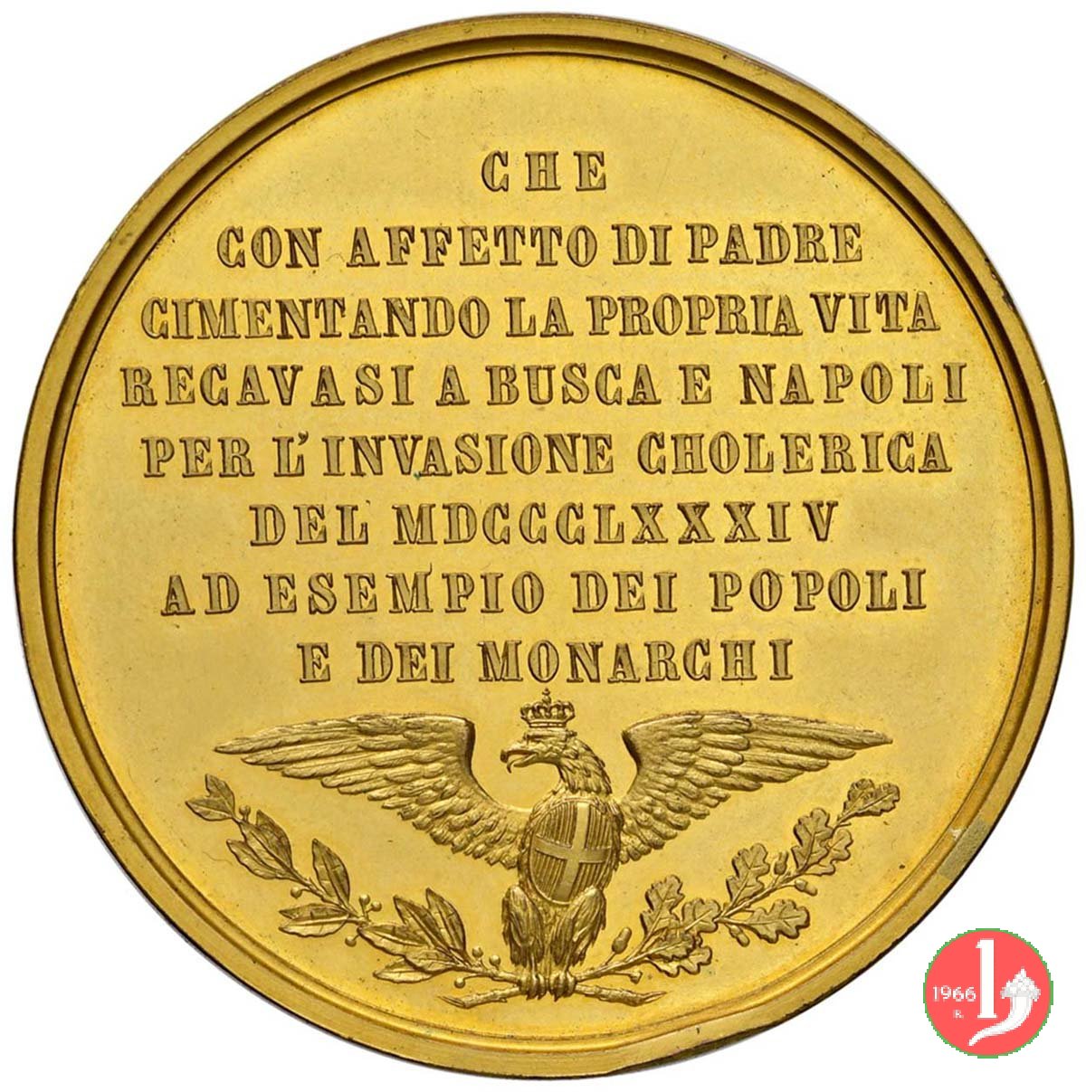 Visita a Napoli per l'Epidemia di Colera 1884 Dritto: AD UMBERTO I L'ITALIA _ COMMOSSA E RICONOSCENTE busto a sx con gicca, camicia e papillon sotto: GIOV. VAGNETTI FECCE IN ROMA NEL 1884 • 85 in basso a dx: A. GENNARELLI DETTO' La figura allegorica dell'Italia turrita, drappeggiata e paludata, volta a sx, regge scudo Savoia e scrive su lapide: NEI CAMPI = DI BATTAGLIA = IN MEZZO = ALLE = SVENTURE ITALIANE = SEMPRE AVANTI = SAVOIA sulla base della lapide: ISCHIA.BUSCA.NAPOLI = PRIN. AMEDEO = CARD. SANFELICE = A. DEPRETIS = P.S. MANCINI = A. SANSEVERINO = N. AMORE = G. BUONOMO = R. DE ZERBI = M. CAPO = M. SCHILIZZI verticalmente a sx: SQUADRA TONCO-LOMBARDA in esergo: GIOV. VAGNETTI INV. E INC. IN ROMA 1884 • 85 | |