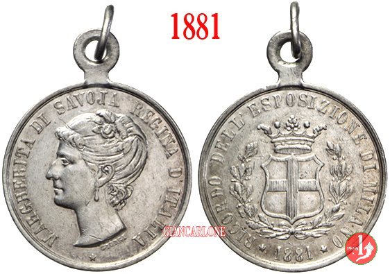 Regina Margherita - Esposizione di Milano 1881 Dritto: MARGHERITA DI SAVOJA REGINA D' ITALIA * testa a sx con orecchini di perle sotto: GIORGI Stemma Savoia coronato tra rami d'alloro legati in basso | |