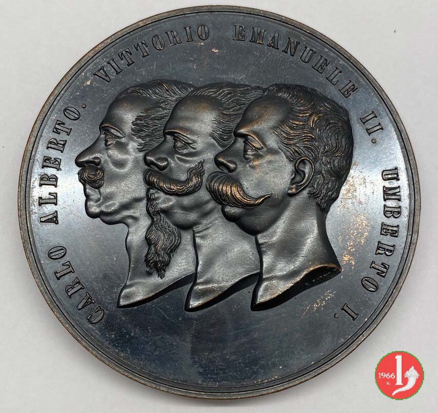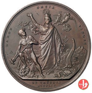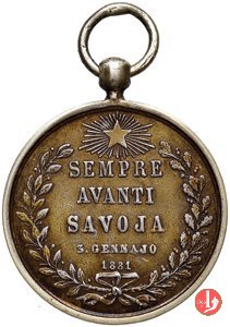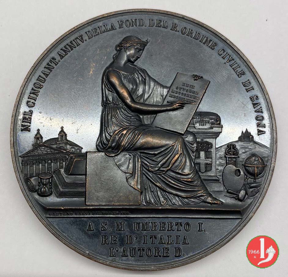 Cinquantesimo dell’Ordine Civile di Savoia Dritto: CARLO ALBERTO. VITTORIO EMANUELE II. UMBERTO I. busti nudi accollati a sx dei tre sovrani sul taglio spalla di Umberto I: G. CALVI F. figura allegorica seduta a dx scrive su tavola: XXIX = OTTOBRE 1831-1881. Ai lati: pergamena, clessidra e volumi, cippo decorato frontalmente da stemma sabaudo, sul quale poggia cuscino e tavola iscritta: R. PATENTI 29 OTTOBRE 1831. Sullo sfondo, a sx la chiesa della Gran Madre, a dx Superga. in esergo: A S.M. UMBERTO I = RE D’ITALIA = L’AUTORE. D. sulla linea dell’esergo: GAETANO CALVI DIS. MOD. ED INC. | |