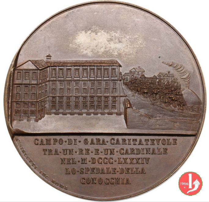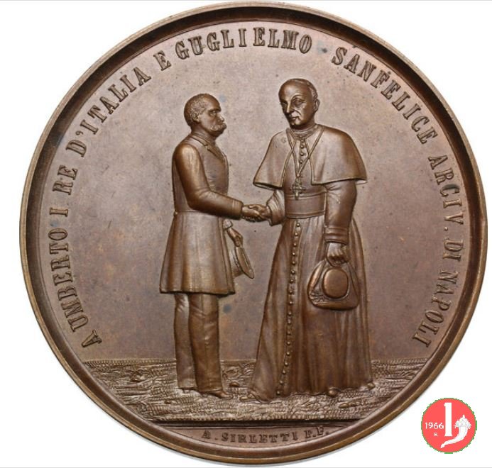 Visita al Convitto Pontano alla Conocchia 1884 Dritto: A UMBERTO I RE D'ITALIA E GUGLIELMO SANFELICE ARCIV. DI NAPOLI Umberto I e Guglielmo Sanfelice, in piedi e affrontati, si stringono la mano; in esergo: A. SIRLETTI P.F. in esergo: CAMPO • DI • GARA • CARITATEVOLE = TRA • UN • RE • E • UN • CARDINALE = NEL • MDCCCLXXXIV = LO • SPEDALE • DELLA = CONOCCHIA in esergo a sx lungo il bordo: A.to SIRLETTI INC. ROMA | |