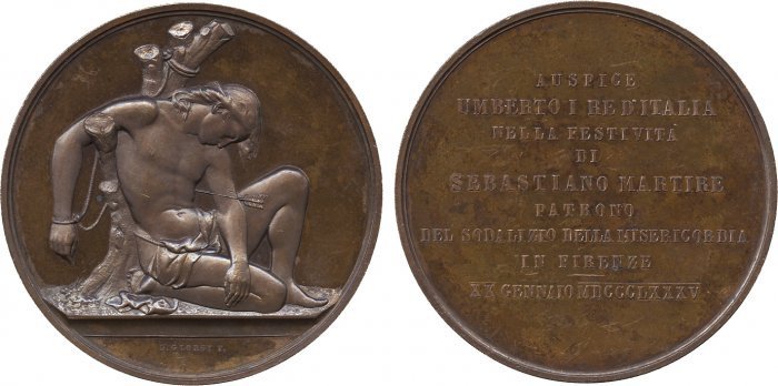 Confraternita Misericordia-San Sebastiano 1885 Dritto: San Sebastiano trafitto da freccia e genuflesso presso un tronco d'albero in esergo: L. GIORGI | |
