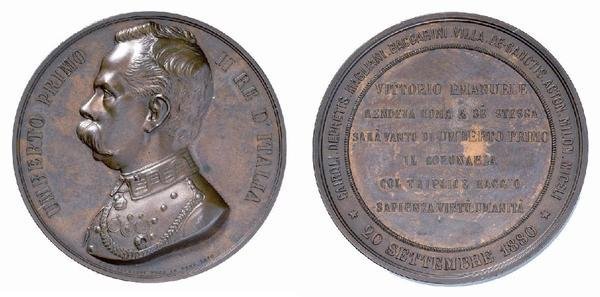 Decennale della Presa di Roma Dritto: UMBERTO PRIMO _ II RE D'ITALIA busto a sx in uniforme sotto:GIOV. VAGNETTI FECE IN ROMA 1880 nel campo: VITTORIO EMANUELE = RENDEVA DONO A SE STESSA = SARA' VANTO DI UMBERTO PRIMO = IL CORONARLA = COL TRIPLICE RAGGIO = - SAPIENZA VIRTU'. UMANITA' - | |