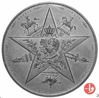 Esposizione di Torino 22mm Dritto: entro stella a cinque punte con tra i raggi monumenti della Città di Torino Verso: Prospetto del palazzo delle esposizioni entro cornice lobata e decorata con otto sculture | |