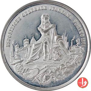 Esposizione di Torino 53mm Dritto: ESPOSIZIONE GENERALE ITALIANA MDCCCLXXXIV Figura allegorica turrita in piedi con mantello corona con serto d'alloro l'operaio, a sx, seduto, a dx putto regge caduceo e tromba, sullo sfondo vista del palazzo delle esposizioni sulla linea dell'esergo, a dx: SPERANZA in esergo: TORINO | |