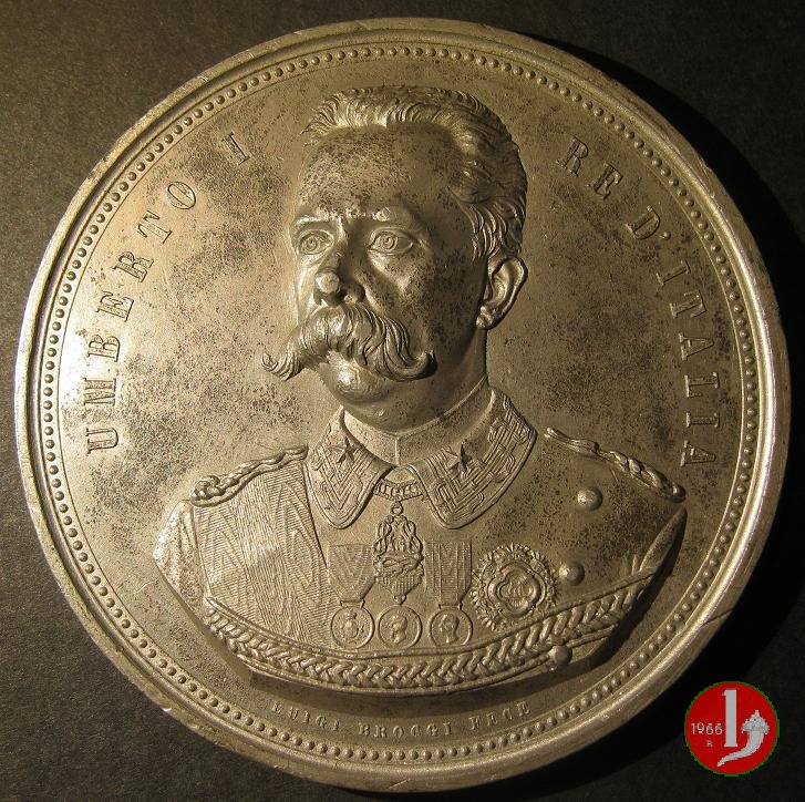 Esposizione di Bologna Dritto: UMBERTO I _ RE DITALIA busto di 3/4 a sx in alta uniforme militare, con decorazioni, ordini cavallereschi, collare della SS. Annunziata Sotto al busto: LUIGI BROGGI FECE | |