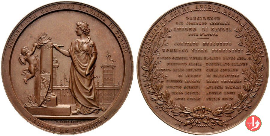 Esposizione di Torino Ai Promotori 70mm Dritto: ESPOSIZIONE GENERALE ITALIANA IN TORINO = AUSPICE UMBERTO I. la figura allegorica della storia laureata, in piedi, volta a sx, scrive su semi-colonna tuscanica 1884; a dx putto impone serto d'alloro alla colonna; alla base della colonna Stemma di Torino tra rami d'alloro e sullo sfondo il Palazzo delle Esposizioni in esergo: P. TERMIGNON | |